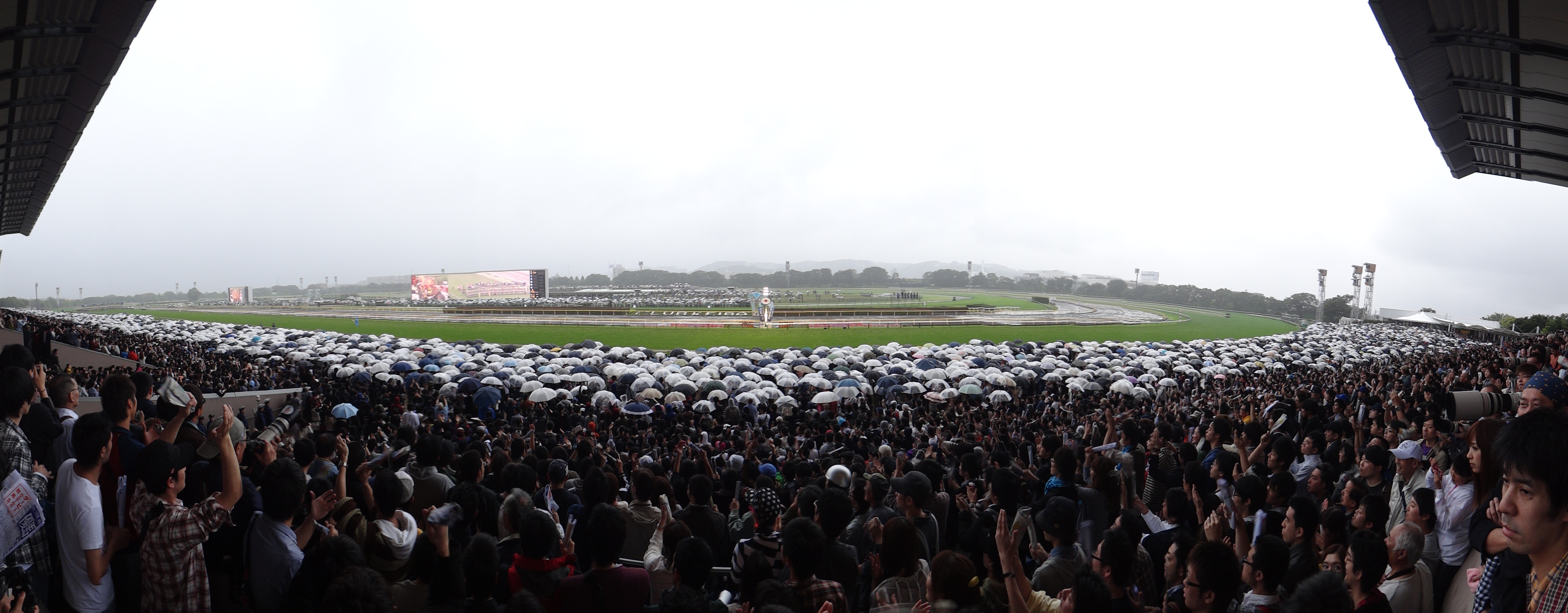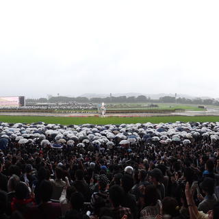 傘の花 昔はねぇ。メインレースともなれば雨にも関係なくみんな傘たたんでレースをみたもんだけどね。 こんな事言っちゃうのはオジサンの証拠なんでしょうね。 とはいえ、これじゃ10万人なんか行くわけないですな。天気もメンバーもこんなものだからしょうがないのかもしれないですけどね。