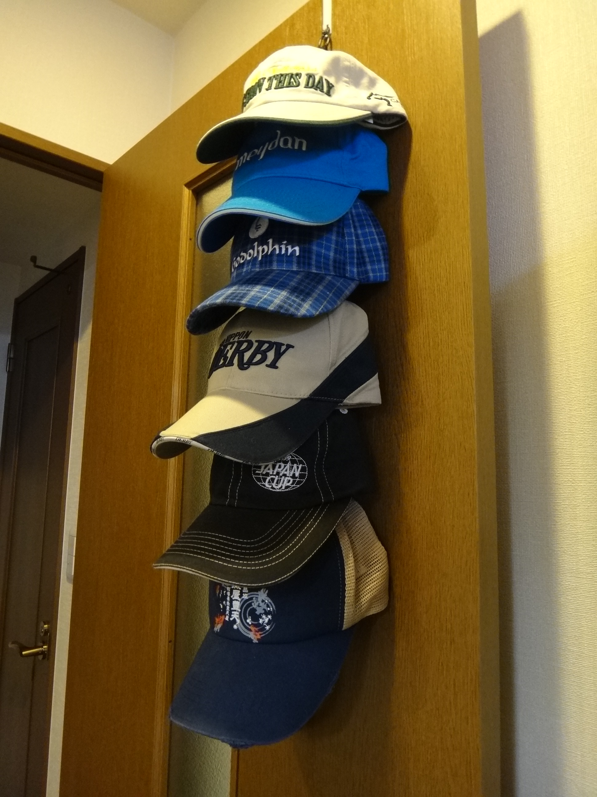 帽子を飾る 競馬の帽子を集めるのが趣味なのですが、集めた帽子を飾るのは結構難しいもんです。そこでうちはこんなのを導入しています。 飾るつもりじゃなければ18個までまとめて飾れます。 これは新しくHats Off用に用意したもの、下半分は昔のコレクションですけどね。