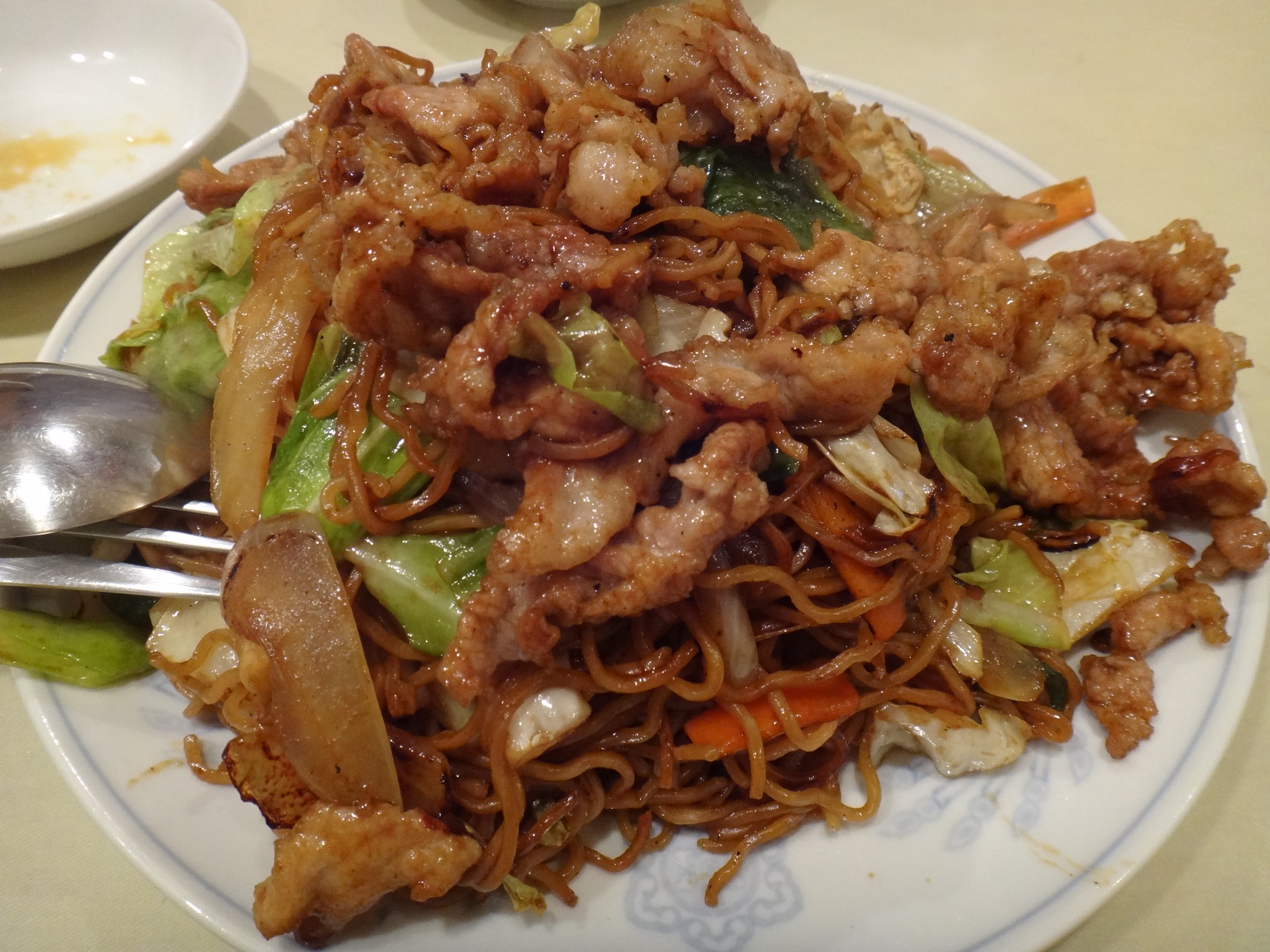 ソース焼きそば ソース焼きそばが美味い中華料理屋がある、ということで行ってみることに。 地図を見ると、例のたい焼き屋さんの斜め向かいぐらい。はるか昔に行ったことがあったけど、その時はそんな話になってたっけか? 確かに麺が細くてコシがあって美味い。ソースも甘ったるくなくて絶妙。確かにソース焼きそばとしてはかなりの逸品。とはいえ、ソース焼きそばそのものがどーもな感じなので、通うほどでもないぐらい。でも、たまに食べたくなるようなメニューです。