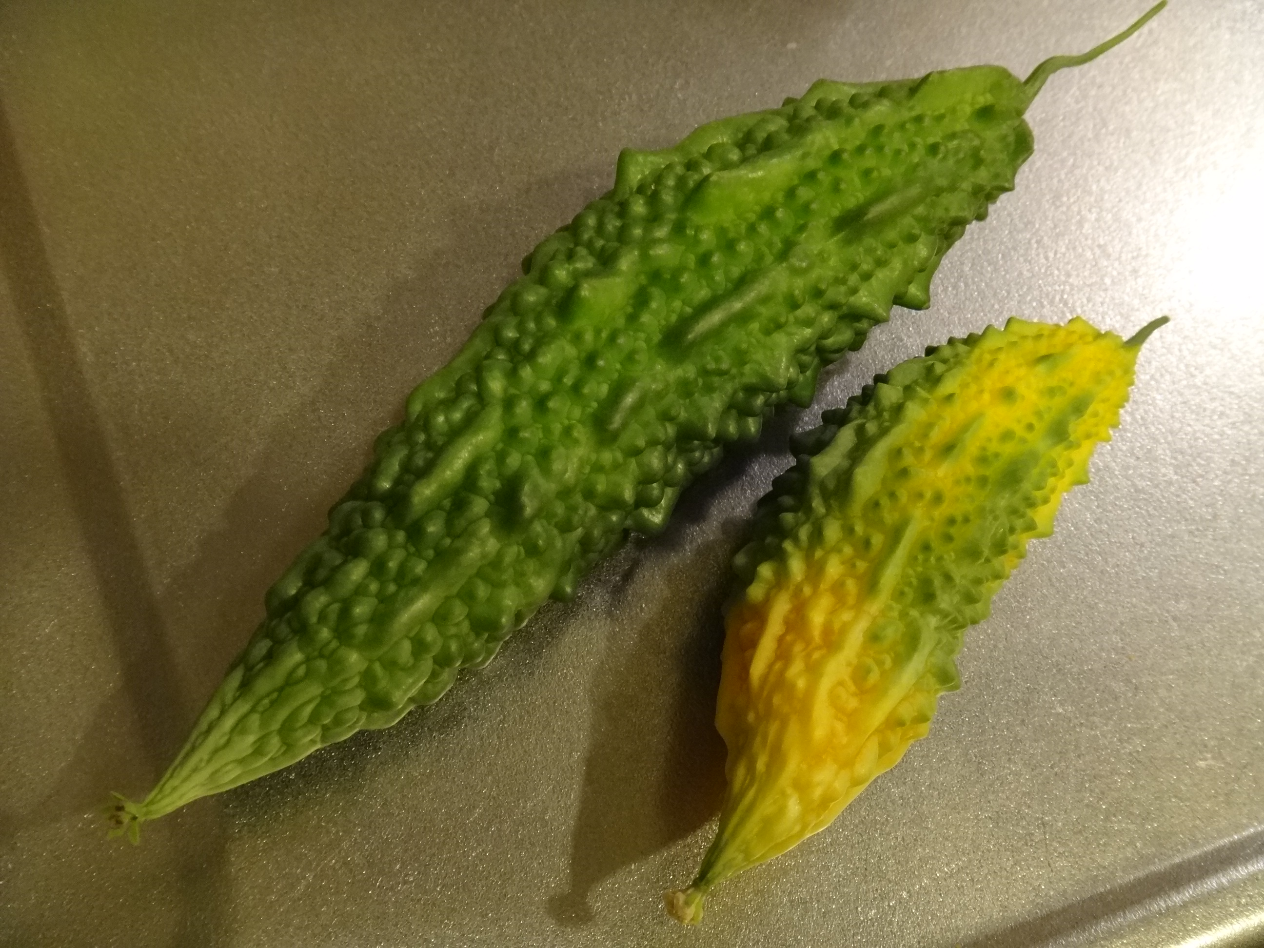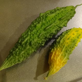 初物 最初のゴーヤはやっぱり黄色くなっちゃうんですよね。この1個がなった日から、あとは花が咲いた日付を考えながら黄色くなる前に採れるになるんです。 最初は定番のゴーヤチャンプルかな。玉子と豆腐を買ってこないと。