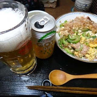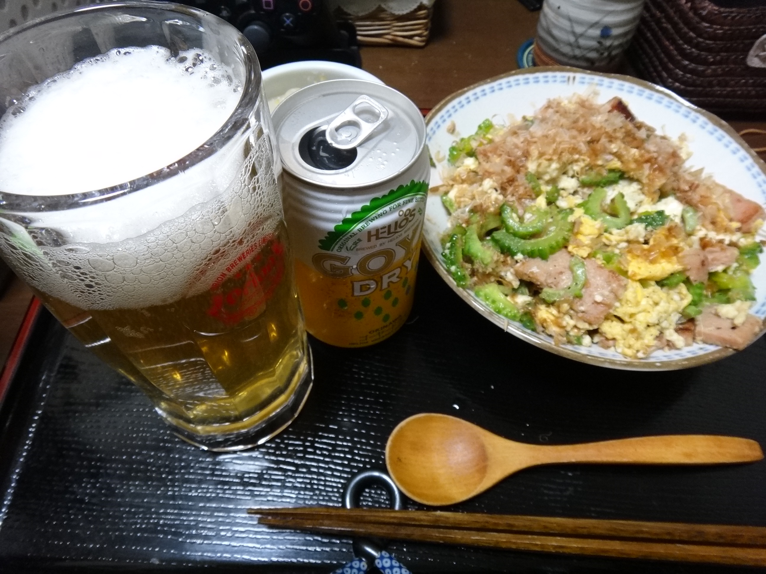 ゴーヤめし ゴーヤも小ぶりになってきたので、ゴーヤ料理もそろそろ終わり。そんなわけで本格的なゴーヤチャンプル。普段は豚肉使って中華系の味付けで作るのですが、今回はスパム使ってかつおぶしをかける和風系。 お供はゴーヤビールで。ゴーヤ×ゴーヤのコラボでした。