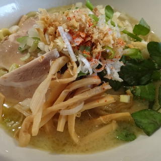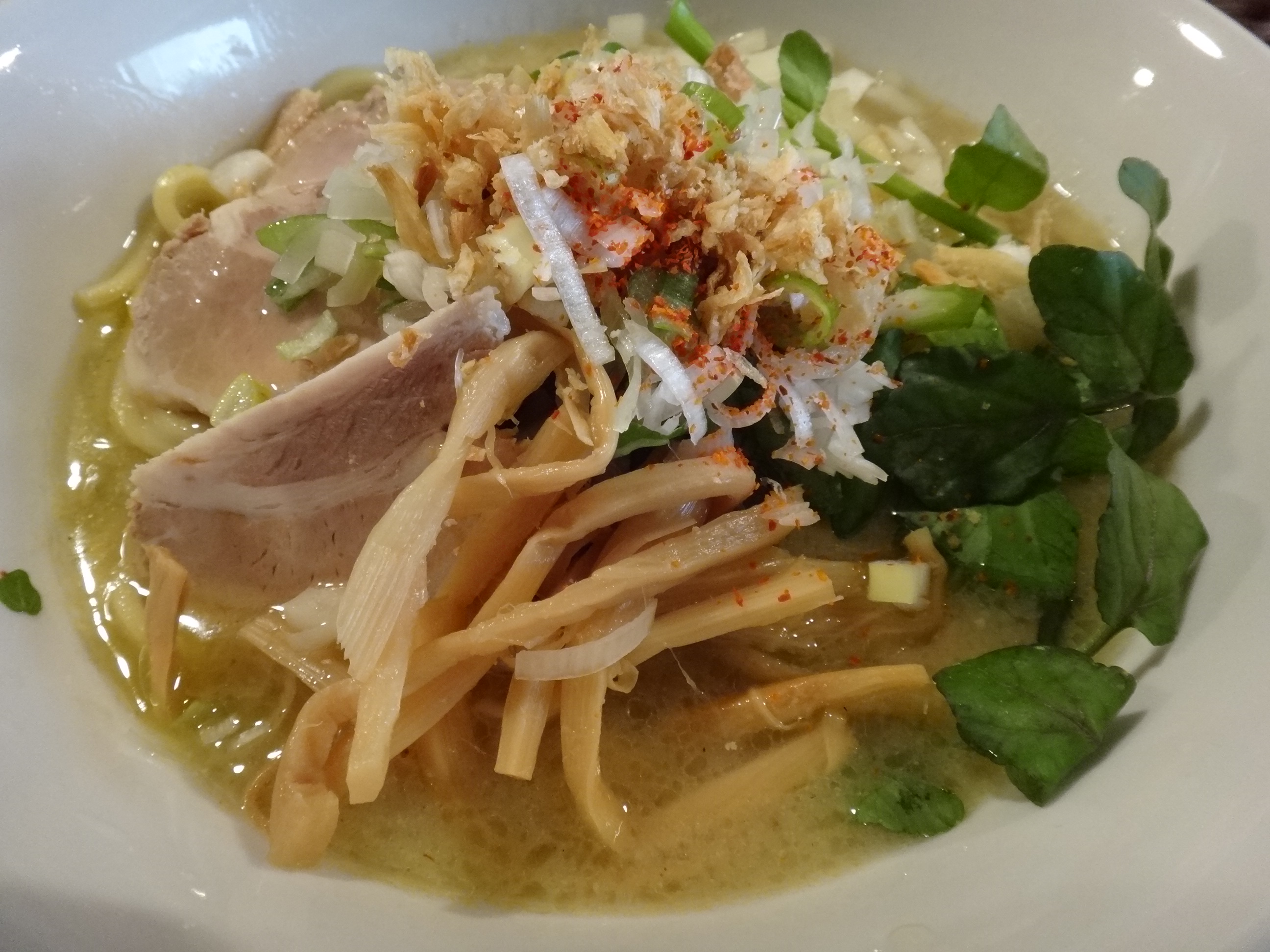 つけ麺でない塩 木曜日限定、つけ麺でない塩。いわゆる汁そばとして塩を食べてみよう、というものです。 なんかやっぱりラーメンと言ってしまうのとは違う食べ物なんですよね、これ。野菜なんかもクレソンとか使ってて、やっぱり普通では食べられないものが出てくる、その上美味い方に裏切られるのがこのお店なんです。