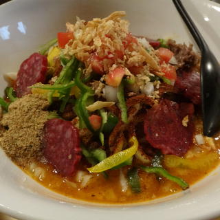 久しぶりのピザそば TV効果で大行列、通常メニューのみの営業になっているこのお店。 それならピザソバ。これもTV効果なのかやたらピザソバ率高し。通常ならどっちかといえばロッソの方が人気ありそうなもんなんですけどね。