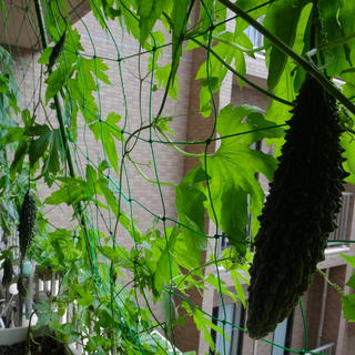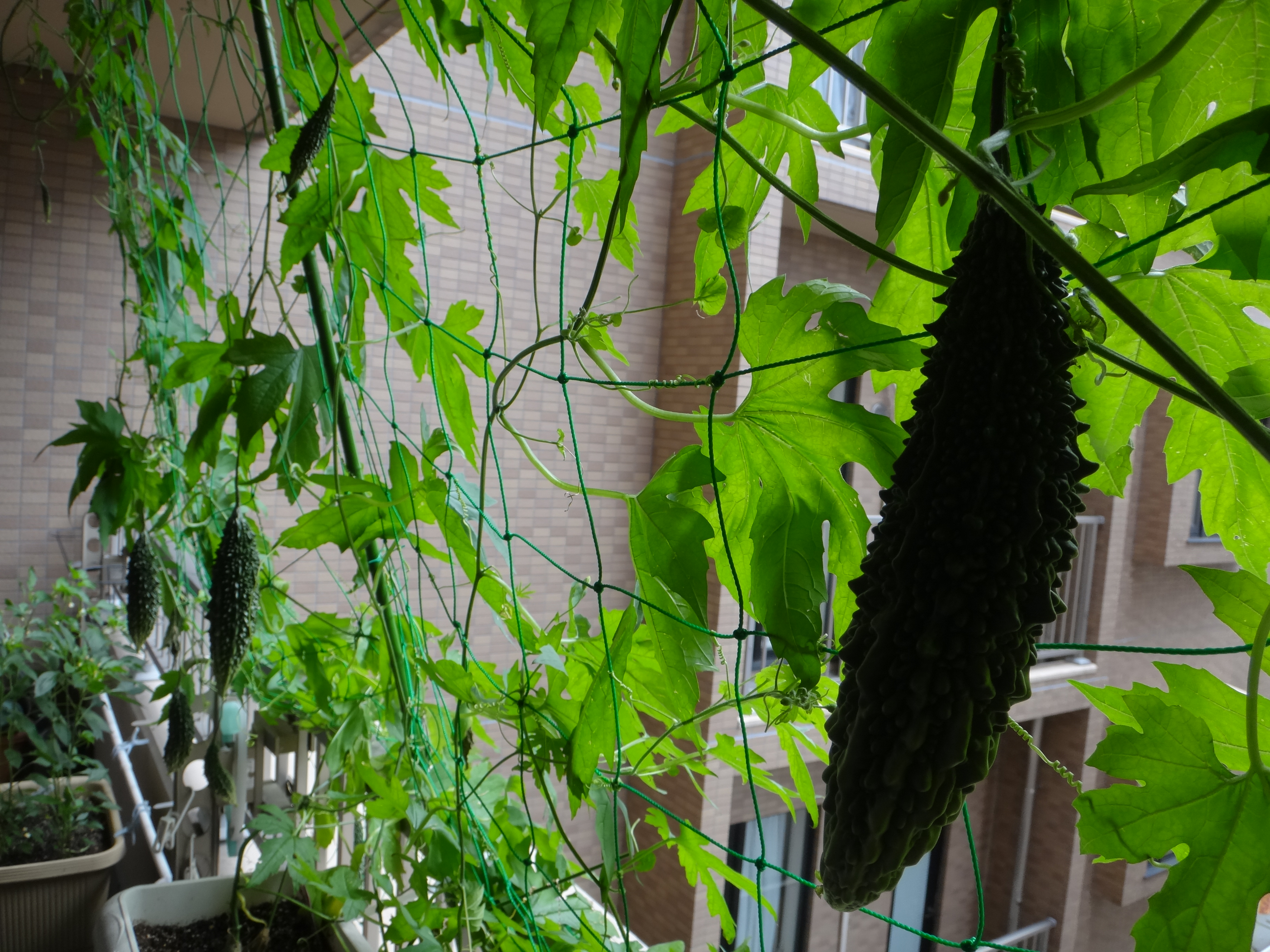 今日のゴーヤの状況。この画面だけでも5個実が生ってます。さらにもっと小さい雌花が大量に....当分困らないですね。というか多すぎて困ってます。