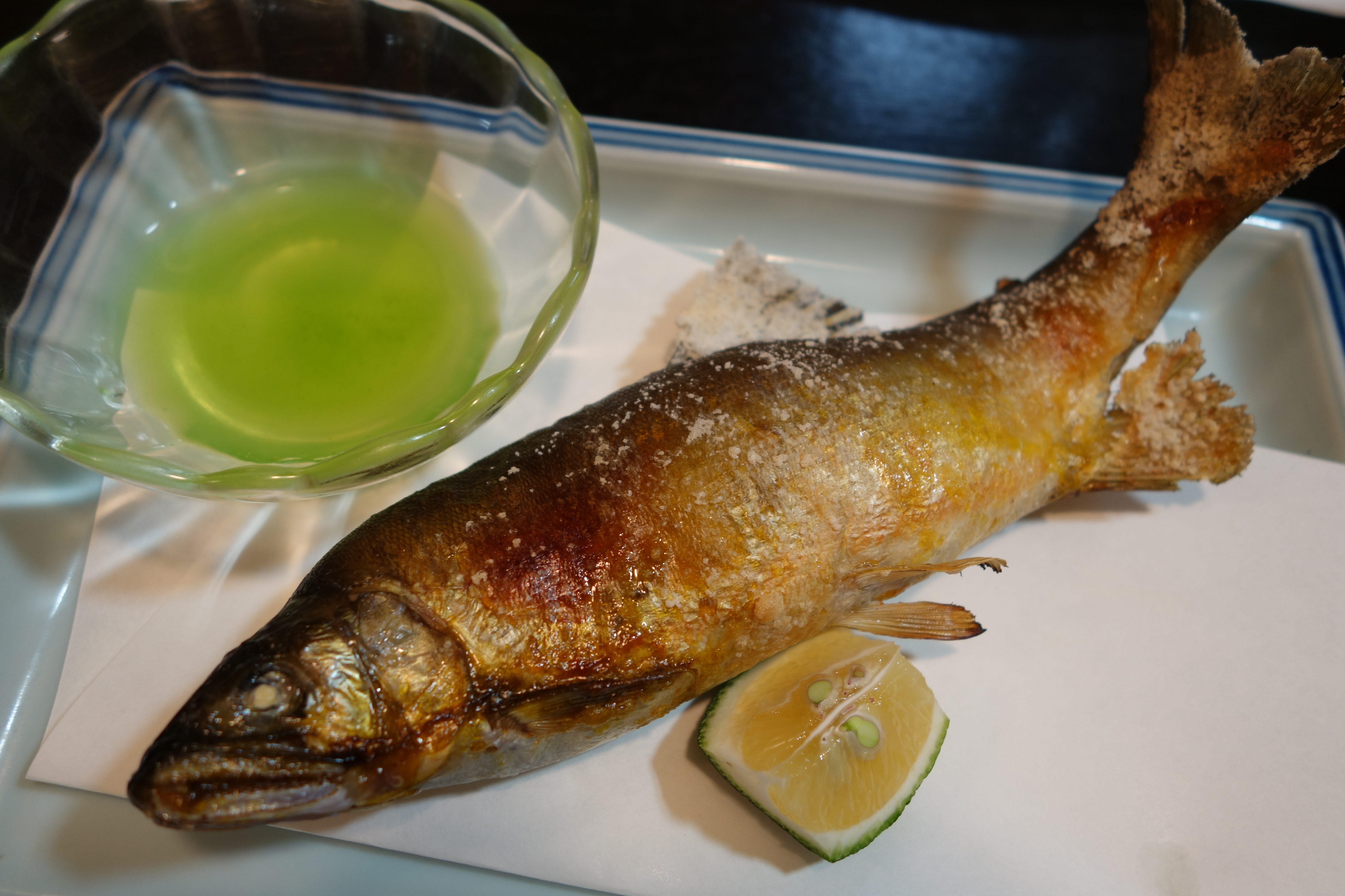 実家の近くのいつもの季節料理屋さんで、鮎の塩焼き。
