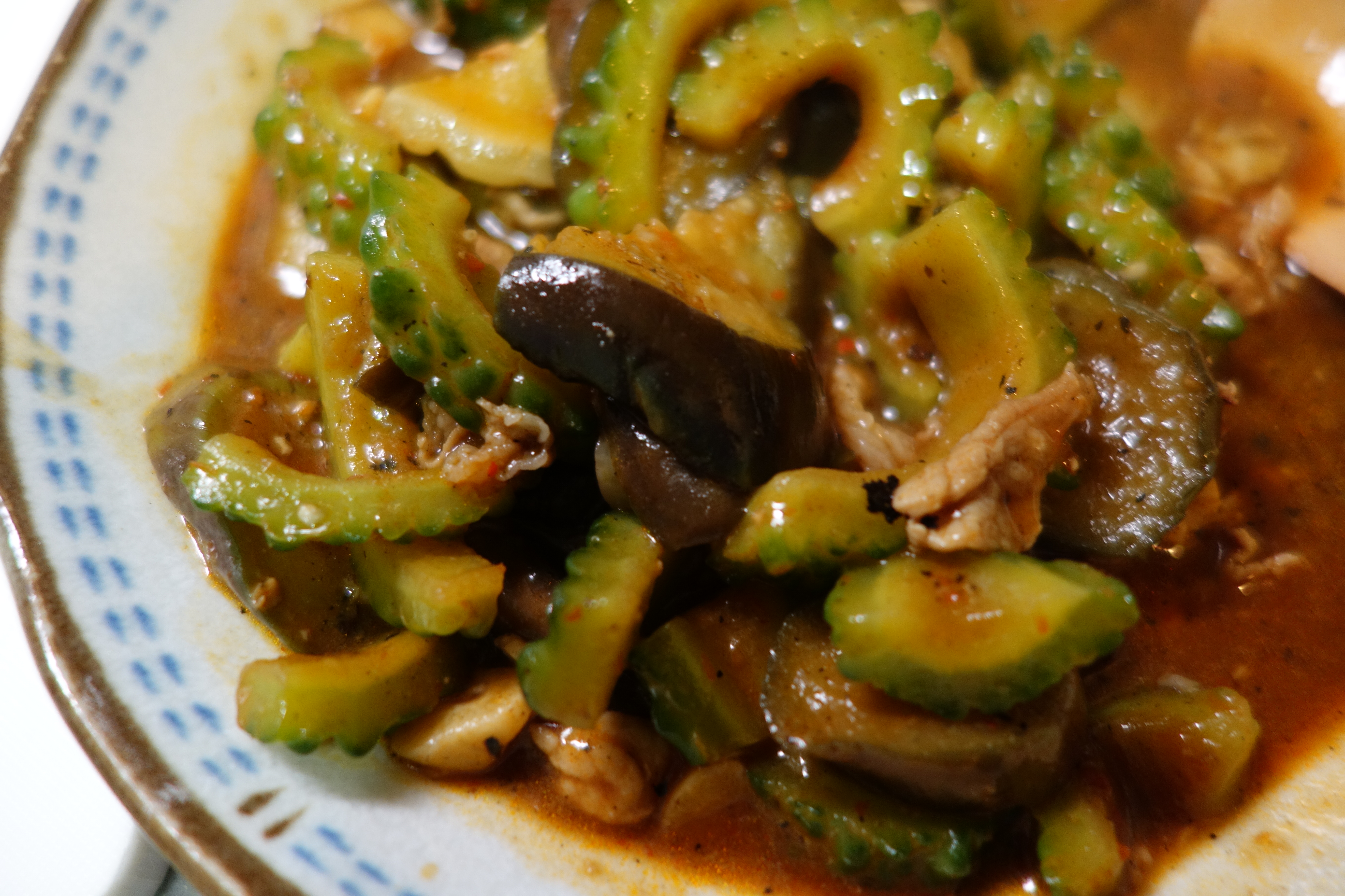 ゴーヤもそろそろ終盤。今日は麻婆ナスならぬ、麻婆ゴーヤナス。辛苦くてうまいです。