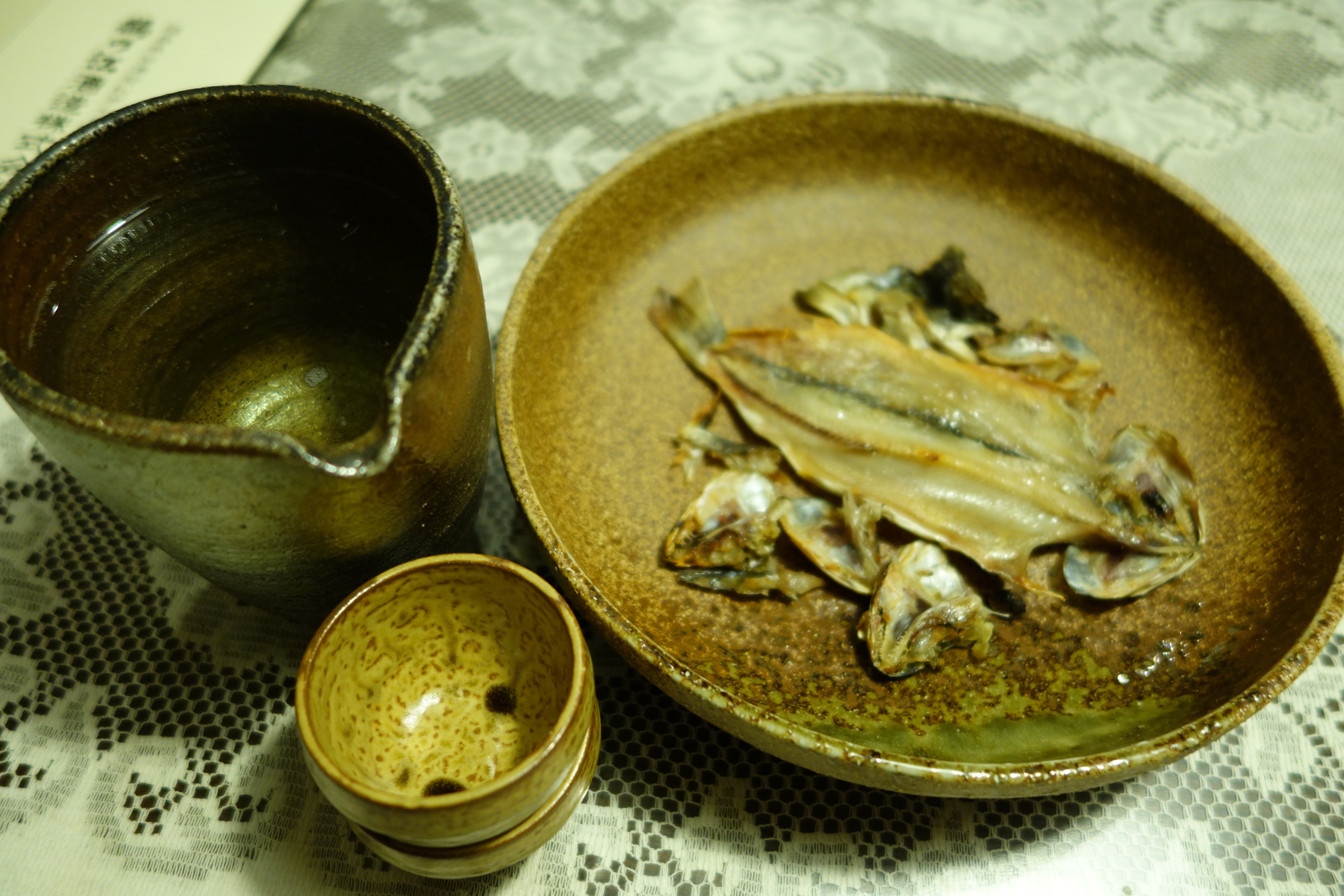 ヤマメ酒 大きいイワナとかなら、骨酒という手もあるのですが、なにせ小さいので、干物にしたものを焦げっぽくなるぐらい焼いて、一匹そのまま熱燗をかけてヤマメ酒に。 ヤマメの味がじんわり酒に出てきて、美味かったです。