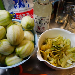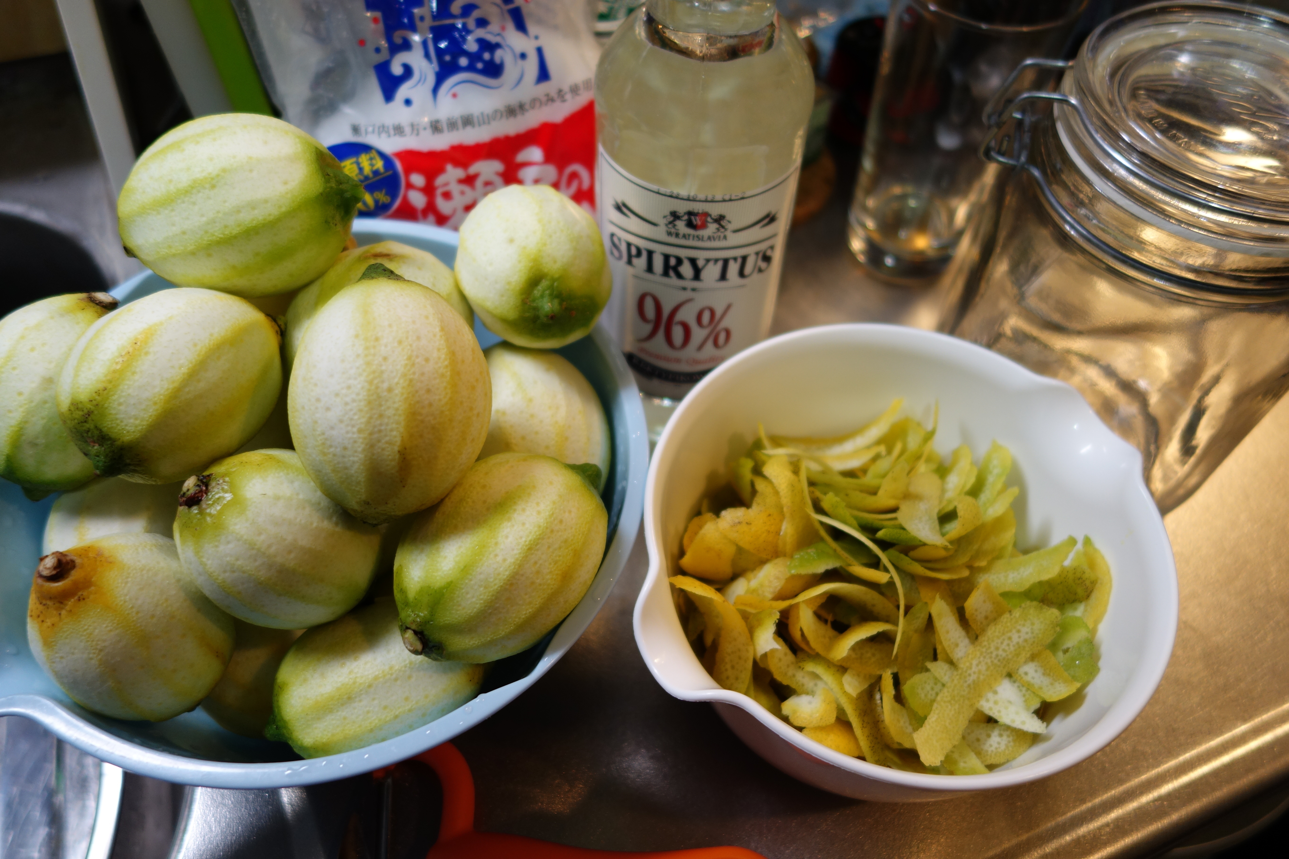 リモンチェッロと塩レモン 例年無農薬のレモンをいただくので、これも例年通りリモンチェッロの準備。レモンの皮をたっぷりむいて96度のウオッカ、スピリタスに漬けます。残りの実の部分は今年も塩レモンにしてみようかと。