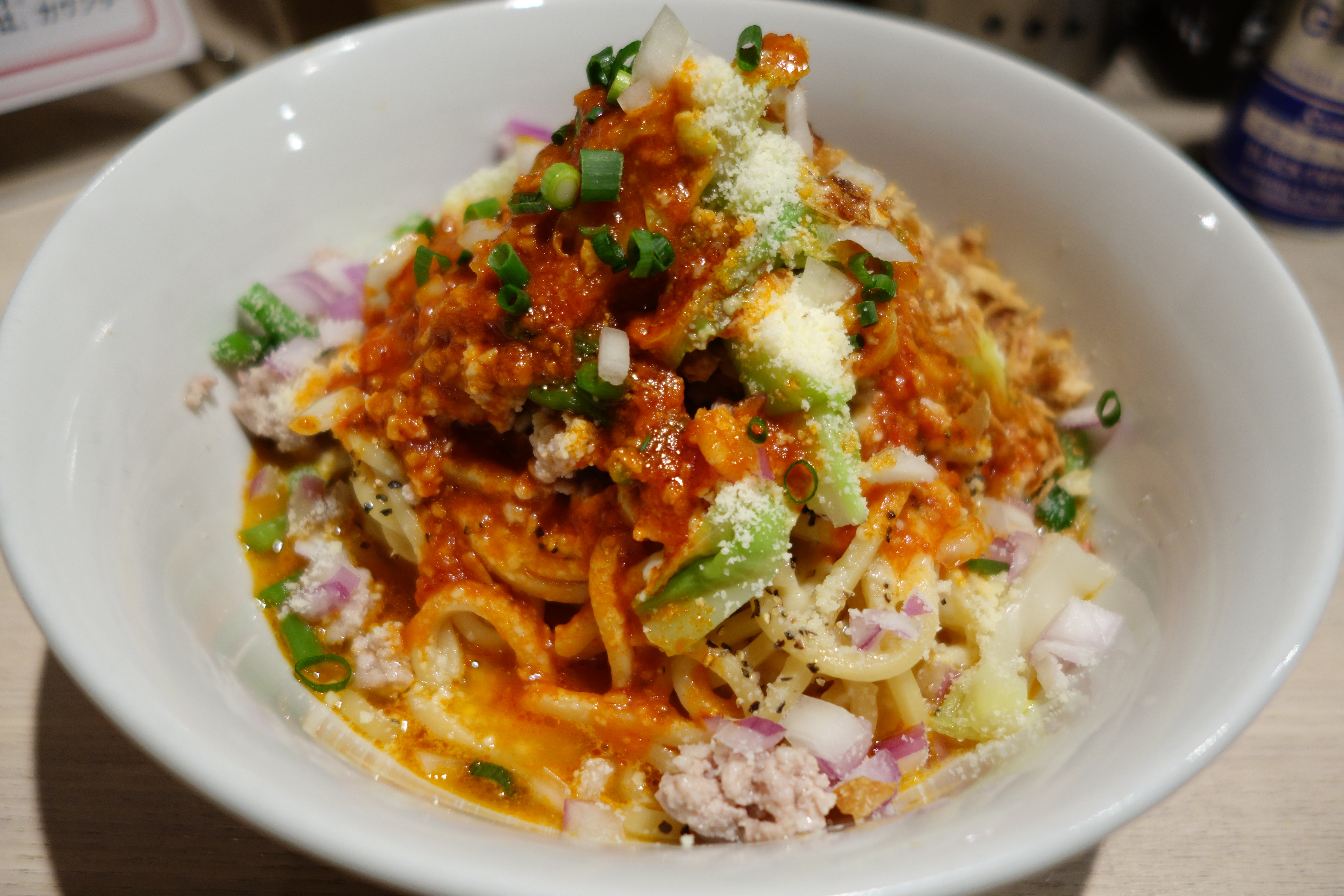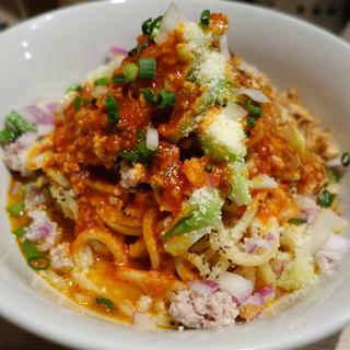 アラビアータ、辛いまぜそば。あまり辛いといいつつそれほど辛くないメニューのこのお店。これは本格的に辛い、けど美味い。