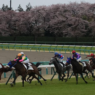 毎年恒例の競馬場の桜と馬。先頭を切ってるのは最近話題の女性ジョッキーです。