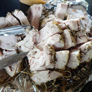 ローストポーク 恒例のBBQでのダッチオーブン料理。最近はローストポークを作ってます。今回は特に大成功。肉の選び方もわかってきました。1.5kgでもダッチオーブンを考えると高さの低い肉を選んで、上にハーブを載せて焼くのがいいんですね。