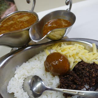 豆の最後は豪華トッピング。お店オススメのチーズ挽肉+かれー玉子。