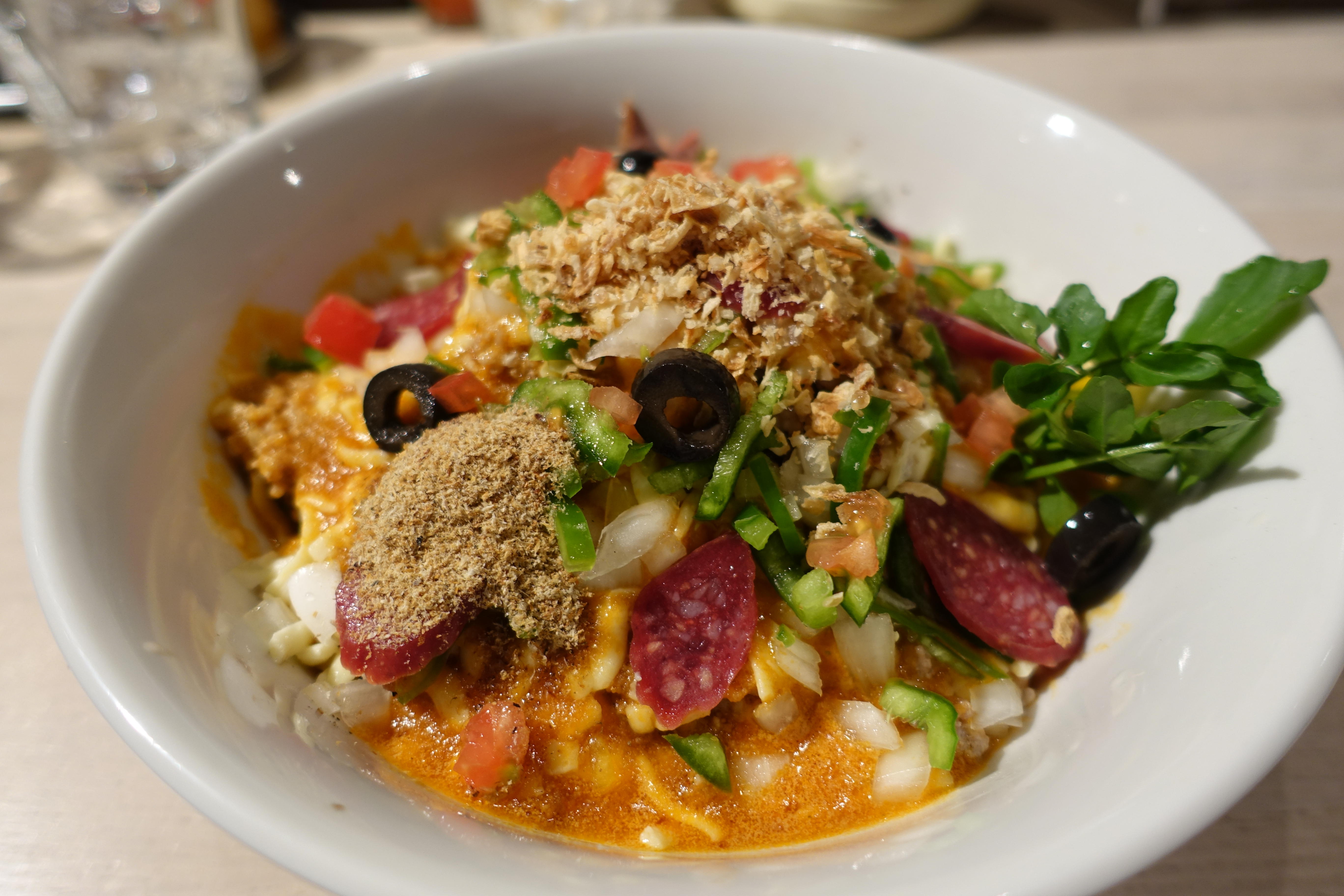 自分のお店のメニューがカップ麺になるってすごいですよね。こちらのお店もそんなお店の仲間入り。Xデーは5月22日だそうです。そんなわけで、今日は当然ピザソバ。