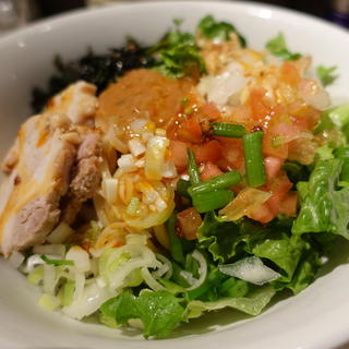 ダービー終わって一段落。ここで反省会。冷やし肉味噌まぜそばです。