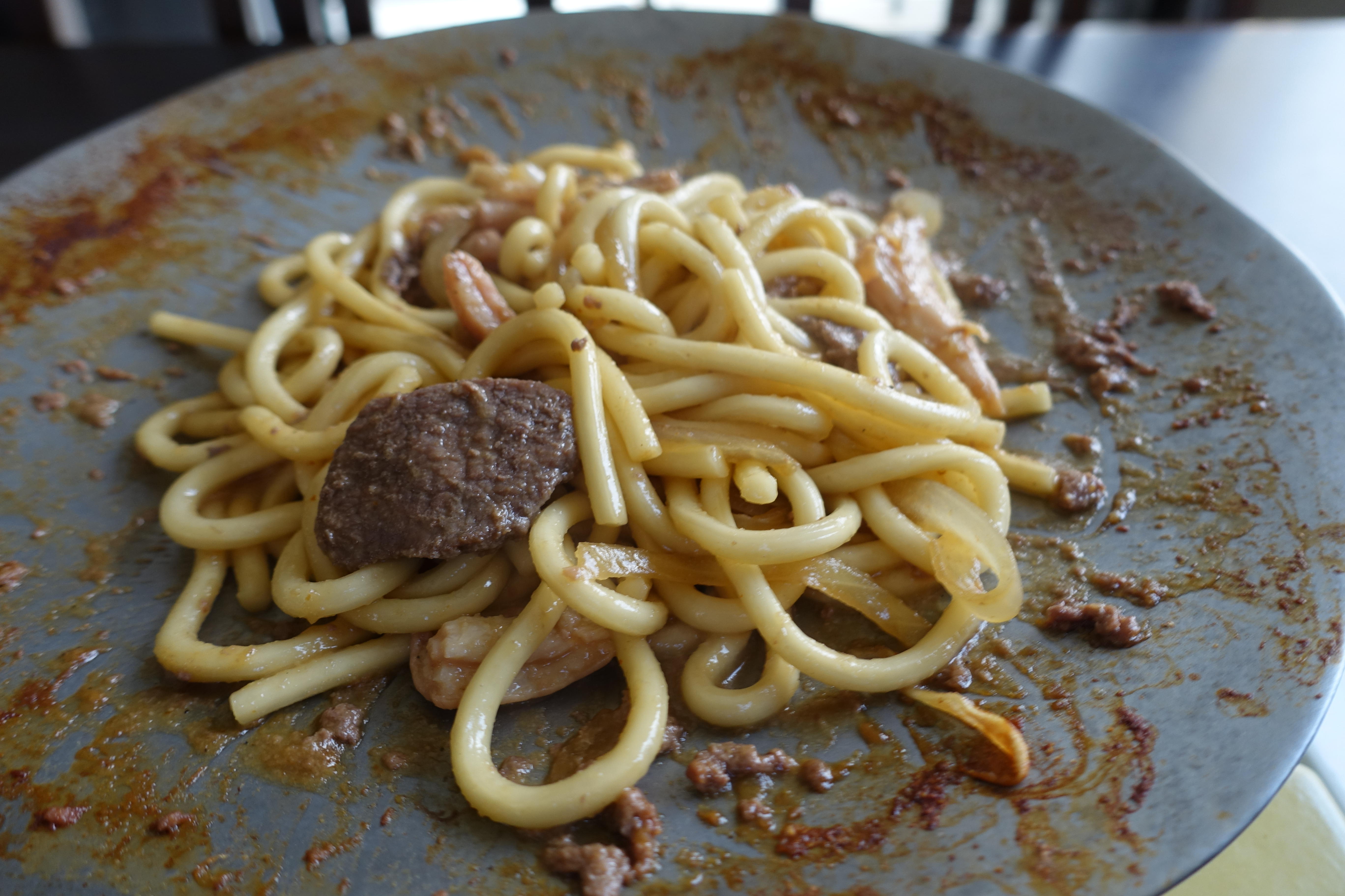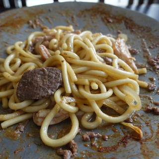 十勝ではジンギスカン鍋じゃなくて、こういう鍋でもいただきます。そしてホルモン+ジンギスカンを一緒に食べるのもいいんですよね。ホルジン。〆はこうやって焼うどんで。