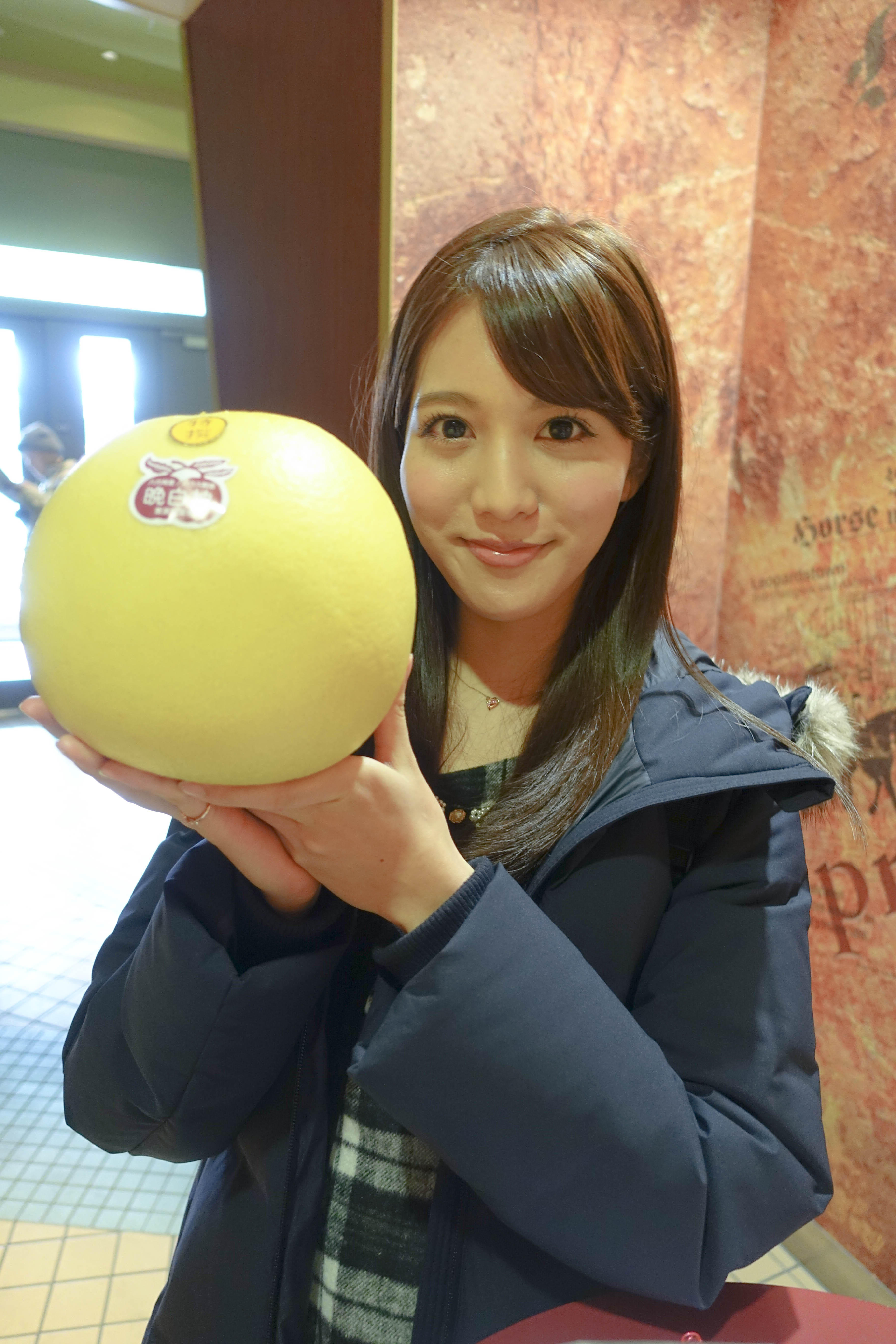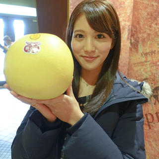 晩白柚。すごく大きく見えるけど、いつもより小さいねって。顔が小さいからホント大きくみえますよね~(笑)確かに今年は小ぶりかも。