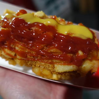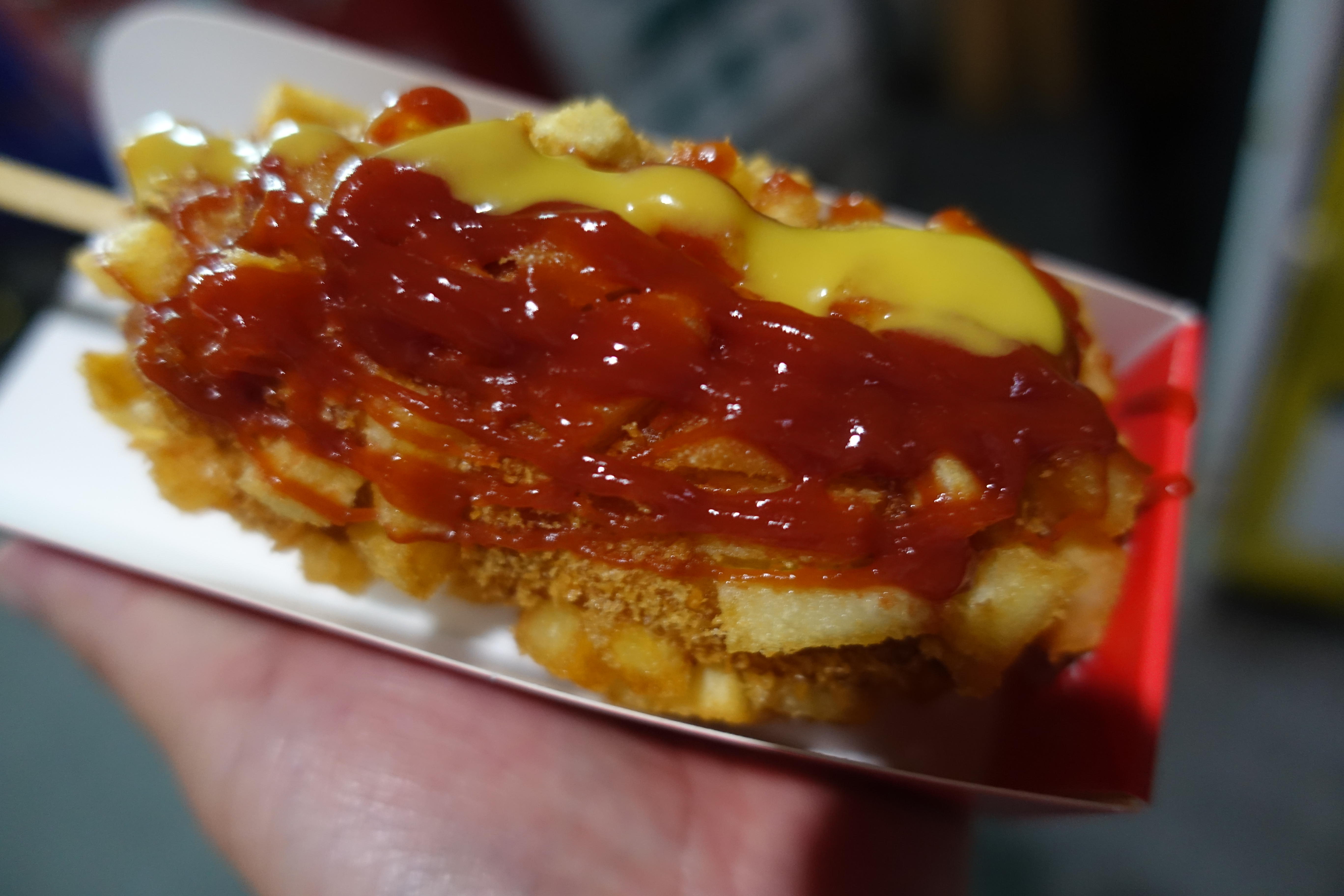 最近流行の韓国のホットドック。米粉でできてます。なにより特徴は中にたっぷりのモッツアレラチーズ。とんでもなくみょーんと伸びます。