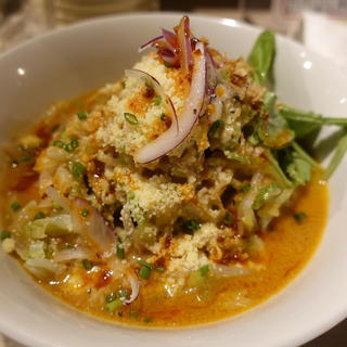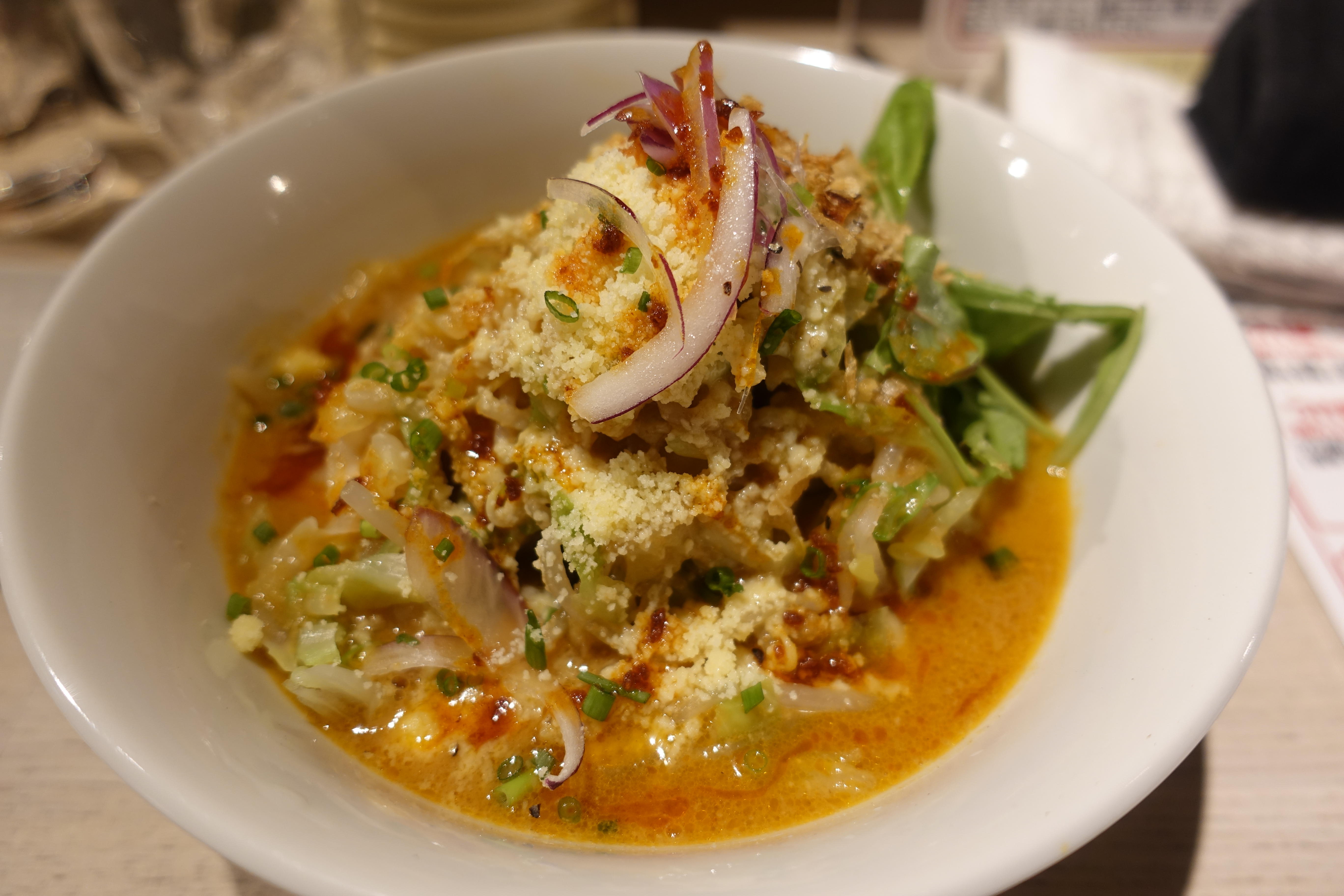 まぜそばは気温が下がると冷めやすくなる。汁そばは全部汁を飲むのは大変。そういう事でハイブリッドとよばれる汁少なめの温かいそばです。リゾットにもしやすいし、なにより温かいんですよね。