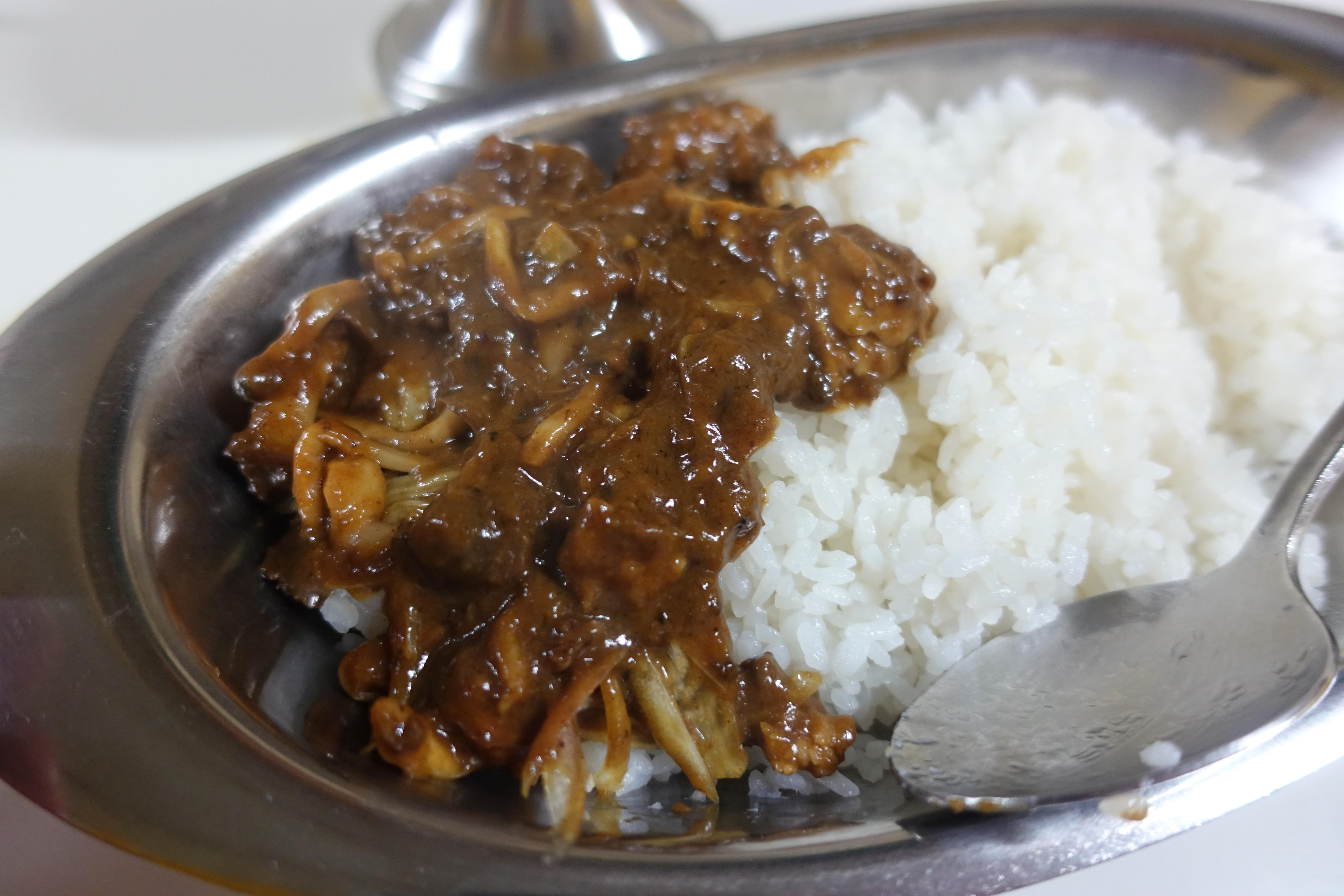 ここではかなり珍しい、すーぷではないとろっとかれー。キノコ+ミョウガバージョン。