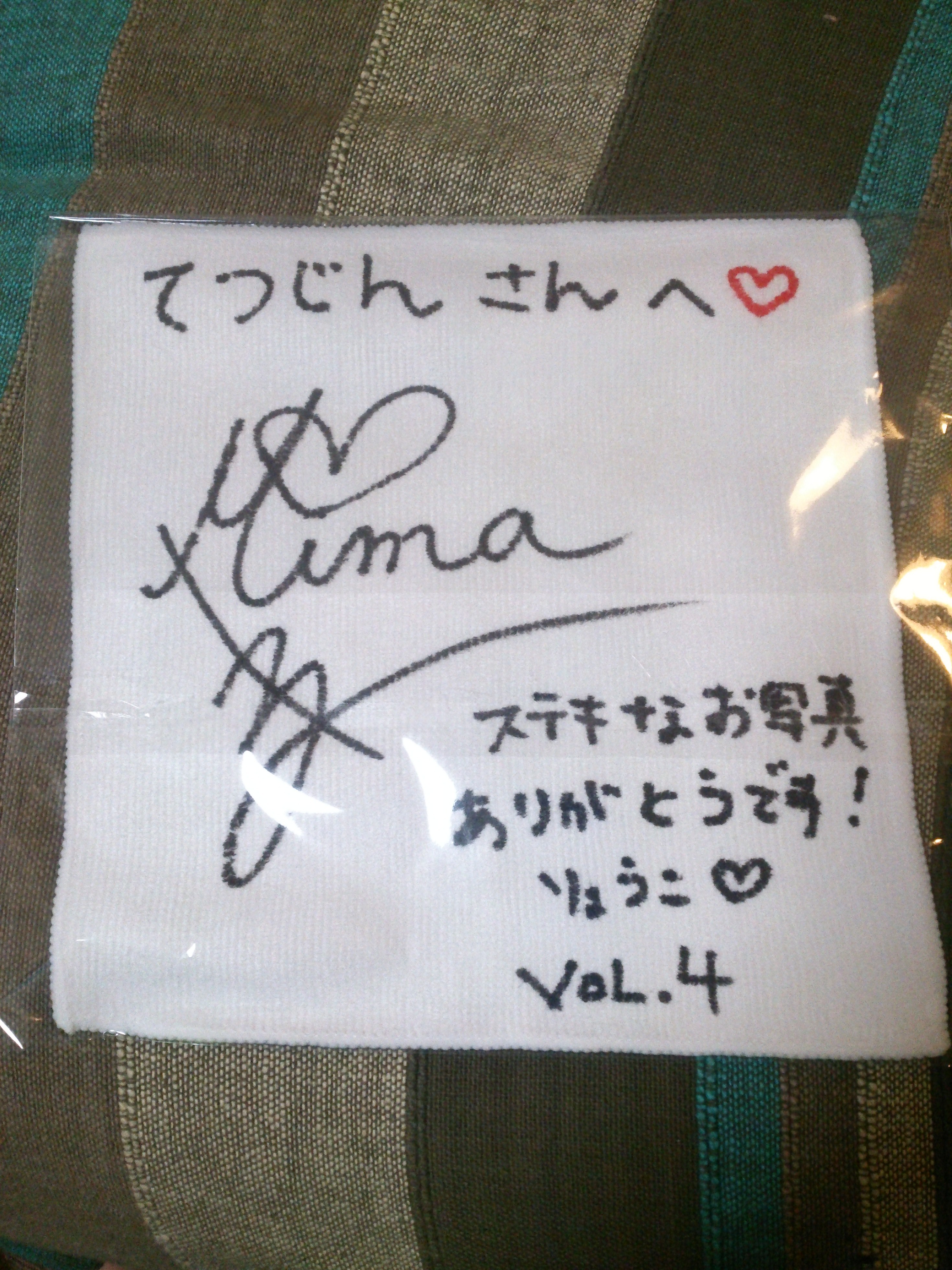 No.4 朝のお天気お姉さんがやる、金曜日夕方の競馬場天気予報。 番組投稿で採用されるともらえるタオルの裏のサインで&コメントです。シリアルNo.がついているんですね。 他のシリアルNo. も狙ってみようかな。 前の記事 次の記事