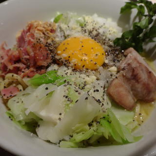 新店舗でも始めました、カルボナーら。牛乳、クリームを一切使わずクリーミーな背脂で仕上げるメニューです。