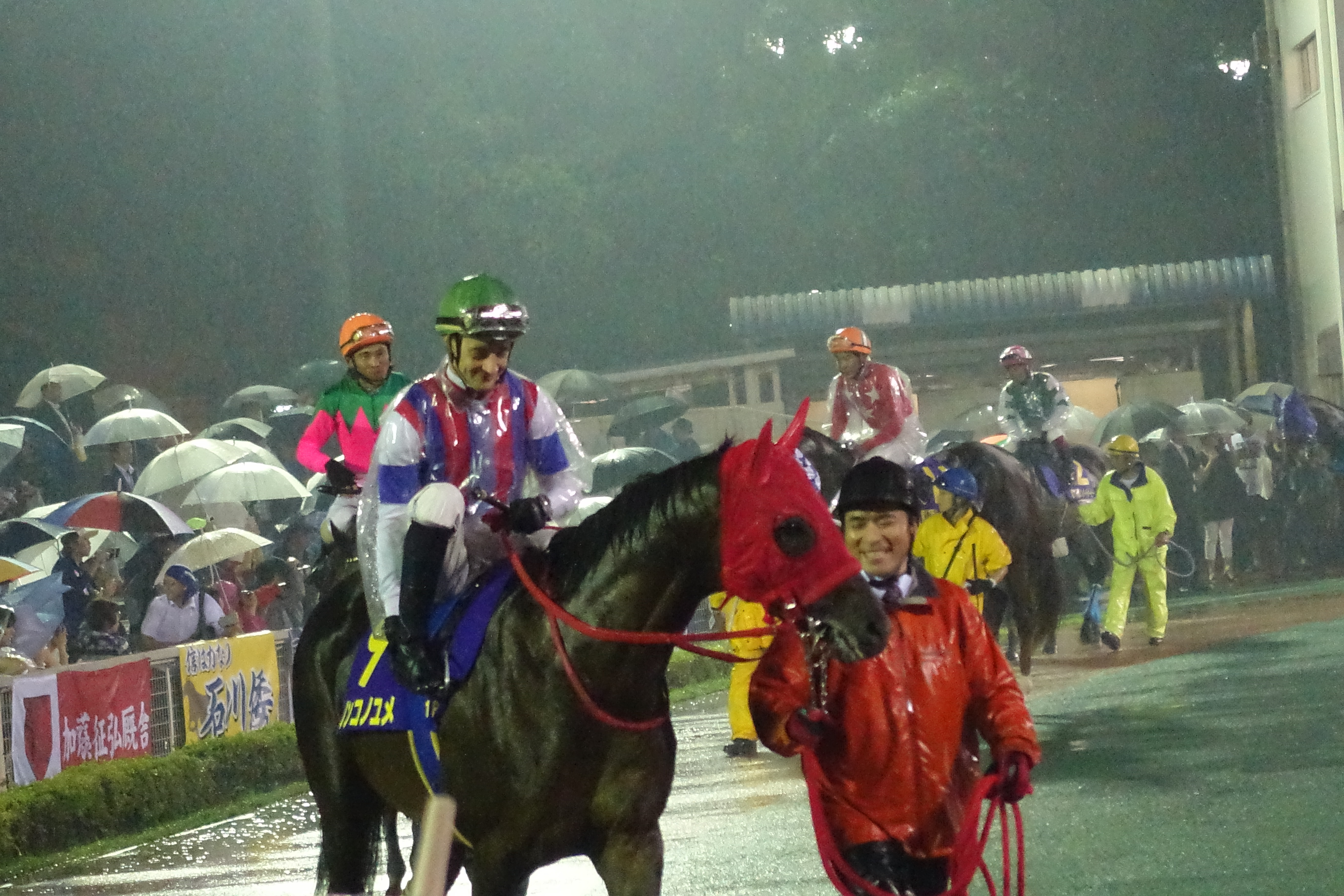 結構な雨降ってるのに、引いてる人も乗ってる人も笑顔。これを覚えていてよかったです、ノンコノユメ圧勝でした。すっかり日本のダート競馬をおぼえちゃいましたね。